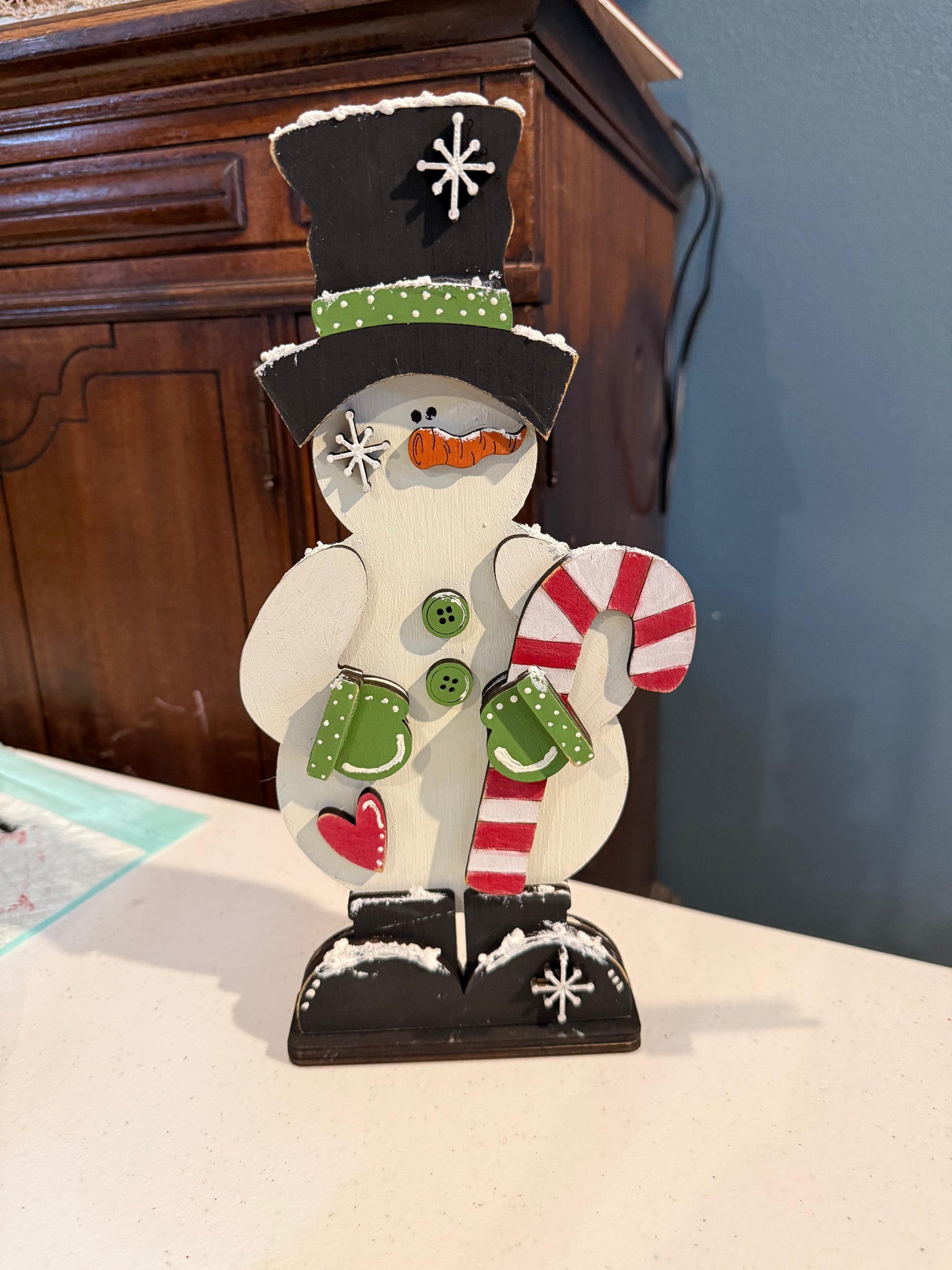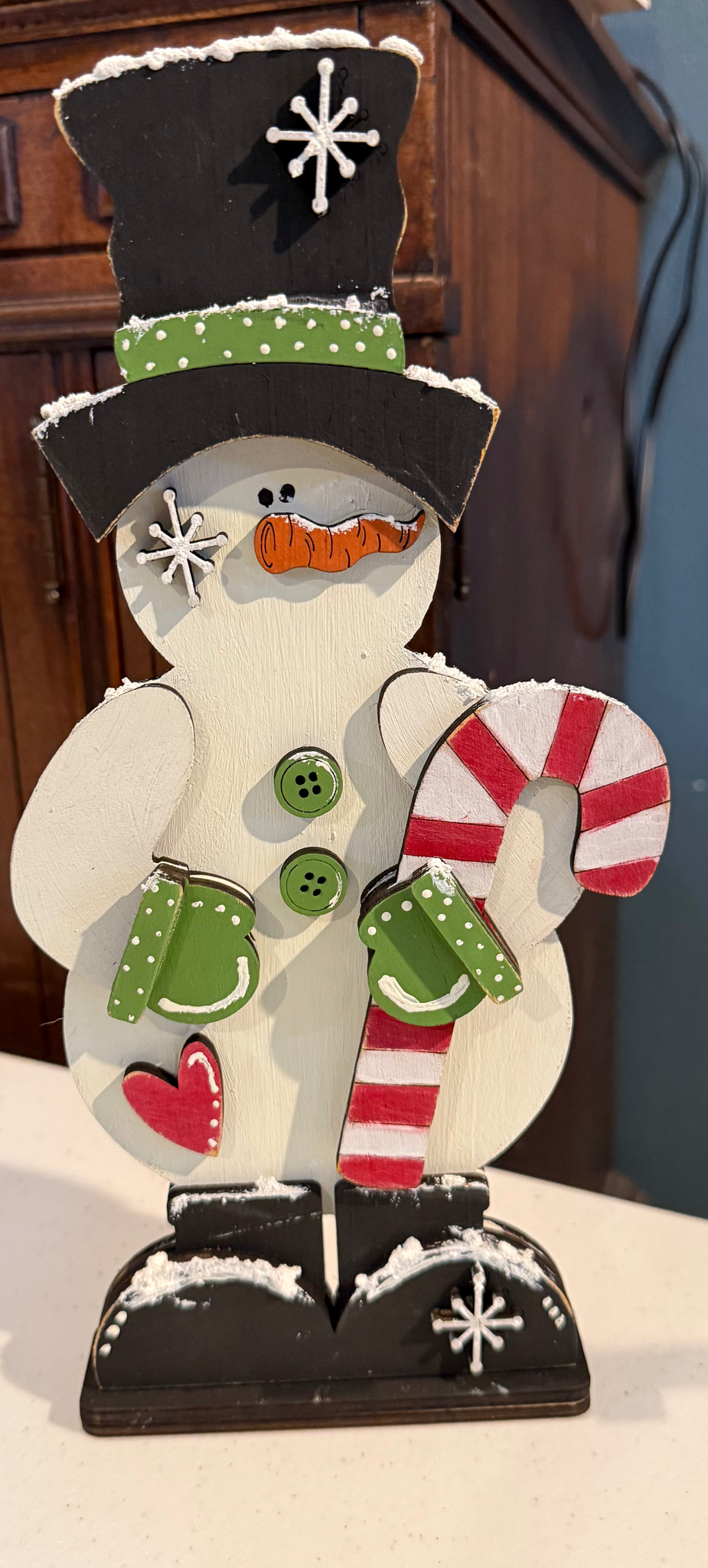 This adorable snowman holding his candy canes is one of the cutest snowman I've seen. He stands approximately 10.75 inches tall and it's almost 5 inches wide. He will come with a stand so that he can stand up. He comes unpainted, but you can paint him any color that you choose.